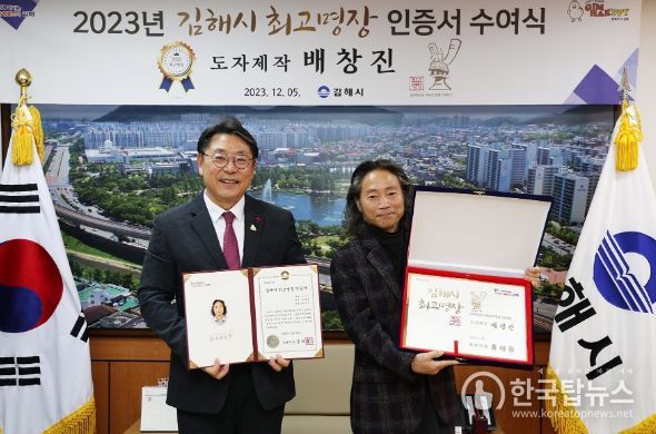 한국탑뉴스 송행임 기자 | 김해시는 지난 5일 2023년 김해시 최고명장으로 선정된 도자제작 부문 배창진(51세, 2대토광도예 대표) 명장에게 인증서와 인증패를 수여했다.