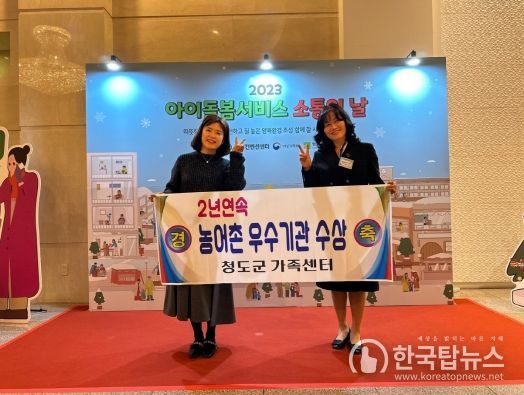 한국탑뉴스 송행임 기자 | 청도군은 여성가족부 주관으로 실시된 아이돌봄 서비스제공기관 운영 평가에서 농촌지역 우수기관으로 선정되어 지난 6일 HW컨벤션센터에서 개최된 "아이돌봄 지원사업 소통의 날”행사에서 여성가족부 장관상을 수상했다.
