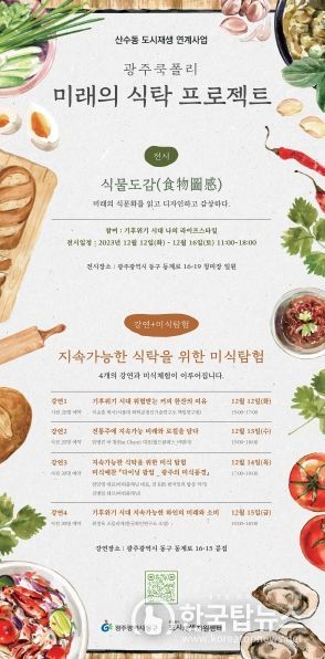 한국탑뉴스 송행임 기자 | 광주 동구는 오는 12~16일까지 산수동에 위치한 광주쿡폴리(콩집·청미장)에서 지속 가능한 미래의 식문화에 대한 담론의 장 ‘미래의 식탁 프로젝트’를 진행한다고 밝혔다.
