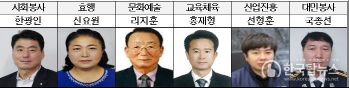효행상 부문은 7년 동안 시아버님을 부양하며 지역사회에서 효를 실천한 ‘신요원’씨, 사회봉사상에 무료급식 봉사 및 다문화 가정과 북한이탈주민 지원활동을 꾸준히 해온 ‘한광인’씨가 선정됐다.