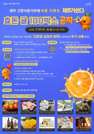㈜한국탑뉴스 차복원 기자 | 제주특별자치도는 고향사랑기부제 활성화를 위해 ‘제주가 쏜다. 효돈 귤 100박스 공짜~’여름 이벤트를 실시한다고 밝혔다.