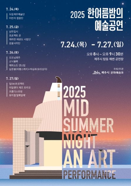 ㈜한국탑뉴스 한민석 기자 | 제주시는 7월 24일부터 27일까지 4일간 탑동 해변공연장에서 ‘2025 한여름밤의 예술공연’을 개최한다.