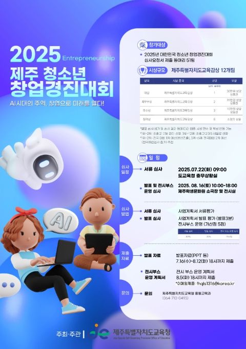 ㈜한국탑뉴스 차복원 기자 | 제주특별자치도교육청은 8월 16일 제주학생문화원 소극장 전시실에서‘2025년 제주청소년 창업경진대회’를 개최한다.