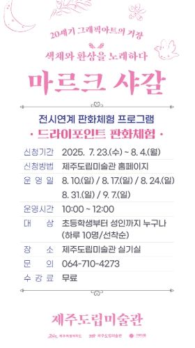 ㈜한국탑뉴스 한민석 기자 | 제주도립미술관이 《마르크 샤갈: 20세기 그래픽 아트의 거장, 색채와 환상을 노래하다》전시와 연계한 판화 체험 프로그램을 선보인다.