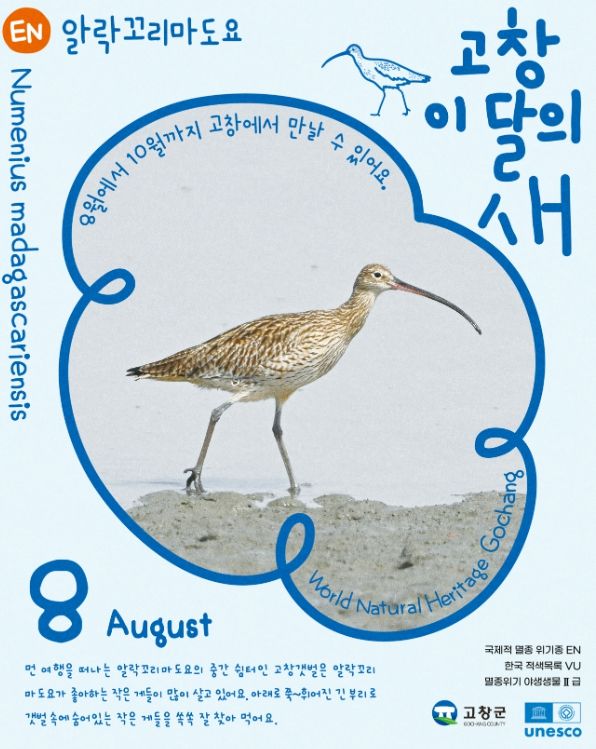 ㈜한국탑뉴스 한기석 기자 | 고창군이 8월 ‘고창갯벌 이달의 새’로 멸종위기 철새인 ‘알락꼬리마도요(학명 Numenius madagascariensis)’를 선정하며, 세계유산 고창갯벌의 생태적 가치를 다시 한번 강조했다.