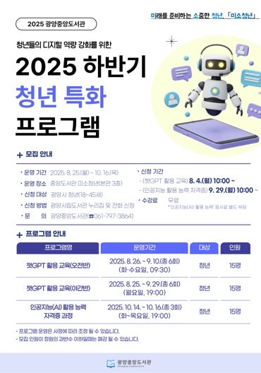 ㈜한국탑뉴스 한기석 기자 | 광양중앙도서관은 지역 청년들의 디지털 역량 강화를 위해 2025년 하반기 ‘청년 특화 프로그램’을 운영한다고 밝혔다.