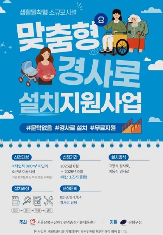 신청 기간은 내달까지이며 예산 소진 시 조기 종료된다. 신청은 서울은평구장애인편의증진기술지원센터 전화로 하면 된다. 접수된 시설을 대상으로 현장 조사가 이뤄지며, 설치 여부가 확정되면 시설에서는 경사로를 설치하면 된다.
