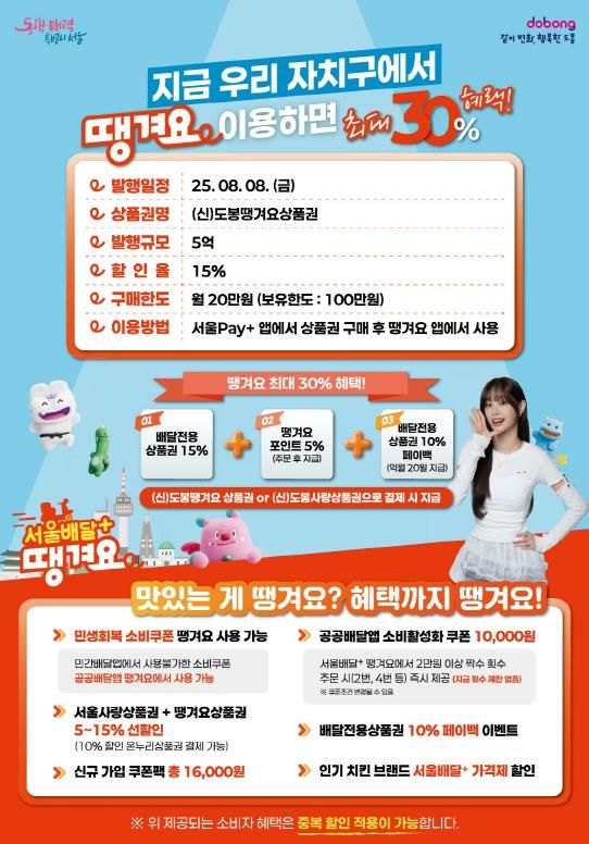 ‘도봉땡겨요상품권’은 공공배달 서비스 ‘서울배달+땡겨요’의 자치구 배달 전용 상품권이다.
