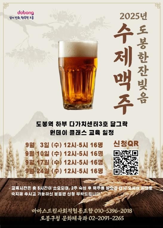 ㈜한국탑뉴스 차복원 기자 | 서울 도봉구가 9월 한 달간 ‘수제맥주 원데이 클래스’를 운영한다.