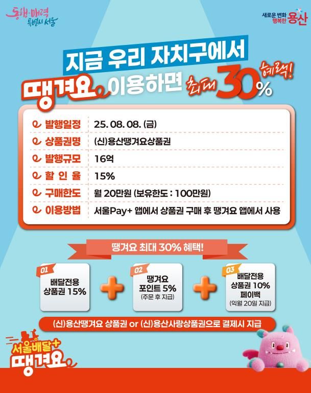 ‘용산땡겨요상품권’은 공공 배달앱인 ‘땡겨요’에서 사용 가능한 모바일 전용 상품권이다. 서울페이플러스 앱에서 15% 할인된 가격으로 구매할 수 있으며, 매월 발행분이 모두 소진될 만큼 높은 인기를 얻고 있다.