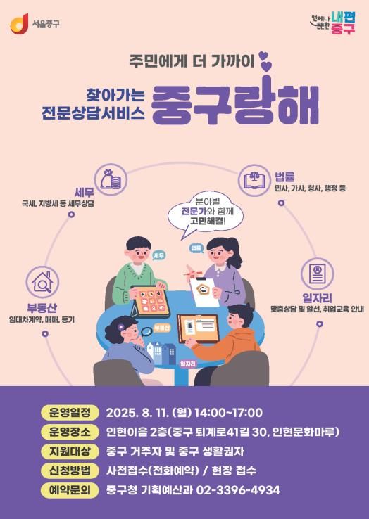 구 관계자는 “생활 속 다양한 문제들을 ‘중구랑해’ 전문가들이 함께 고민하고 해결해 줄 것”이라며 “집 앞에서 받는 전문 상담을 통해 주민 일상에 든든한 지원을 이어가도록 최선을 다하겠다”라고 말했다.