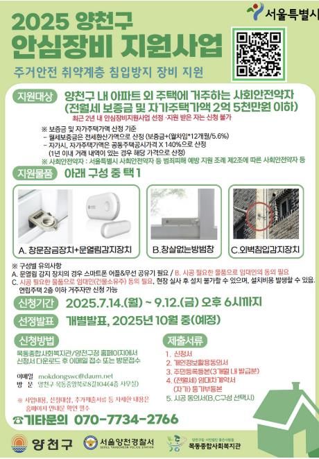㈜한국탑뉴스 차복원 기자 | 양천구는 사회안전약자를 대상으로 실질적인 방범 보호장치를 제공해 생활 안전망을 강화하고자 ‘주거안전 취약계층 침입방지 장비 지원사업’을 올해부터 새롭게 도입하고, 오는 9월 12일까지 신청자를 모집한다고 밝혔다.
