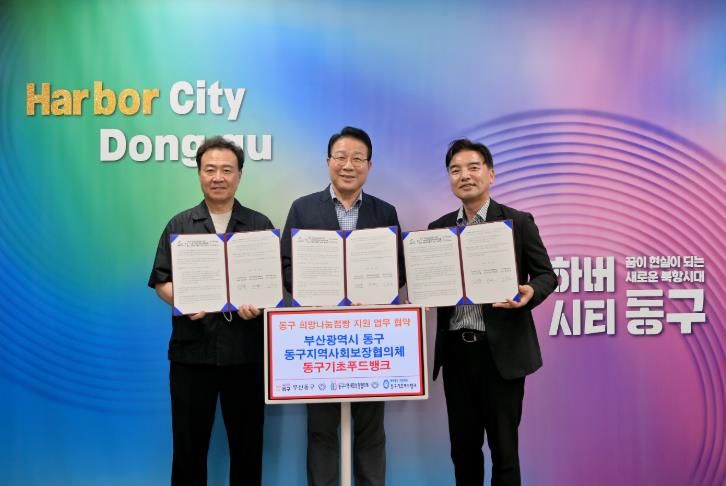 ㈜한국탑뉴스 차복원 기자 | 부산 동구는 지난 22일 동구지역사회보장협의체, 동구기초푸드뱅크와 함께 ‘동구희망나눔점빵’ 지원을 위한 업무 협약식을 가졌다.