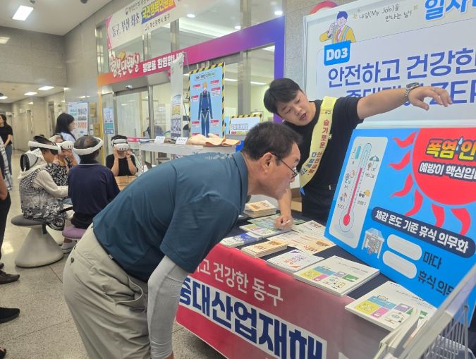㈜한국탑뉴스 차복원 기자 | 부산 동구는 지난 26일, 청사 로비에서 개최된 일자리 박람회에서 ‘안전하고 건강한 동구, 중대재해 ZERO’라는 주제로 '중대산업재해 예방 캠페인'을 진행했다.