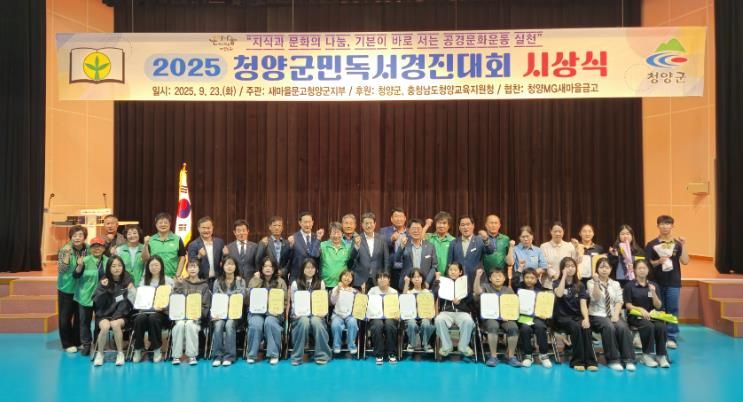 ㈜한국탑뉴스 차복원 기자 | 새마을문고 청양군지부는 지난 23일 청양군 문화체육센터에서 ‘2025 청양군민 독서경진대회 시상식’을 열고, 독서문화 확산에 기여한 학생과 군민들을 격려했다.