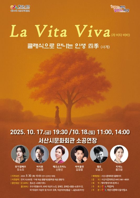 ㈜한국탑뉴스 차복원 기자 | 충남 서산시는 10월 문화회관의 기획공연으로 클래식 콘서트 ‘La Vita Viva(라 비타 비바): 클래식으로 만나는 인생 사계(四季)’를 마련했다고 29일 밝혔다.