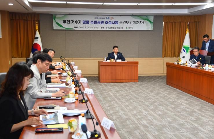㈜한국탑뉴스 차복원 기자 | 울산 울주군이 29일 군청 비둘기홀에서 이순걸 군수와 관계 공무원 등이 참석한 가운데 ‘두현저수지 명품 수변공원 조성사업 실시설계용역’ 2차 중간보고회를 개최했다.