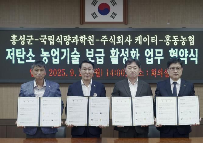 ㈜한국탑뉴스 차복원 기자 | 홍성군은 29일, 국립식량과학원, KT(케이티), 홍동농협과 함께 저탄소 농업기술 보급 활성화를 위한 4자간 업무협약(MOU)을 체결했다고 밝혔다.