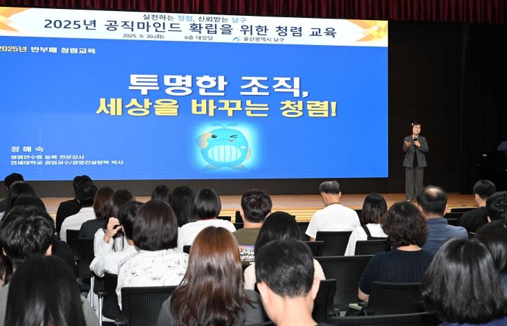 서동욱 남구청장은“청렴교육이 공직자로서의 가치관과 책임 의식을 되새기고 일상 업무에서 실천할 수 있는 청렴 문화를 확산하는 데 큰 도움이 되길 바란다”며“앞으로도 직원들이 스스로 공직 마인드를 강화할 수 있도록 다양한 교육과 지원을 추진하겠다”고 말했다.