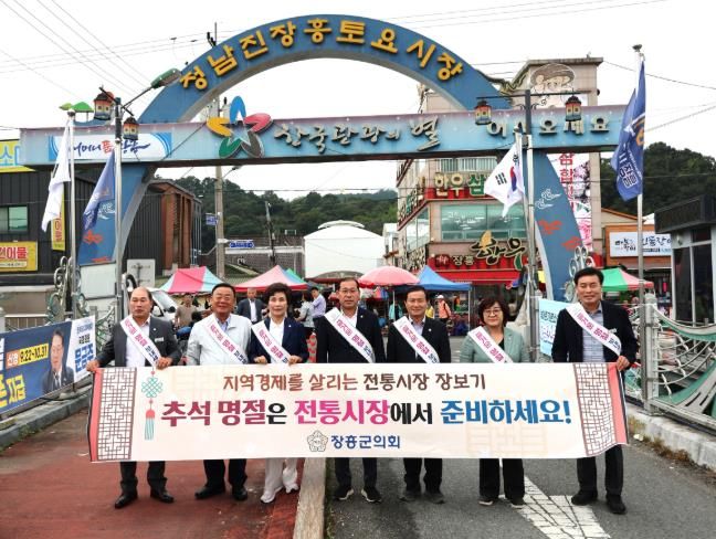 ㈜한국탑뉴스 송행임 기자 | 장흥군의회는 10월 2일, 지역 대표 전통시장인 정남진 토요시장에서 ‘추석 맞이 장보기 행사’를 열었다.