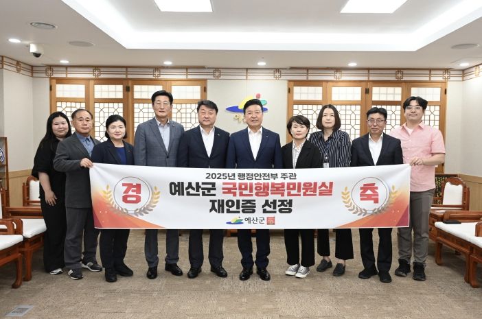 ㈜한국탑뉴스 차복원 기자 | 예산군은 행정안전부가 주관하는 ‘2025년 국민행복민원실’ 평가를 통과해 재인증 기관으로 선정됐다고 17일 밝혔다.