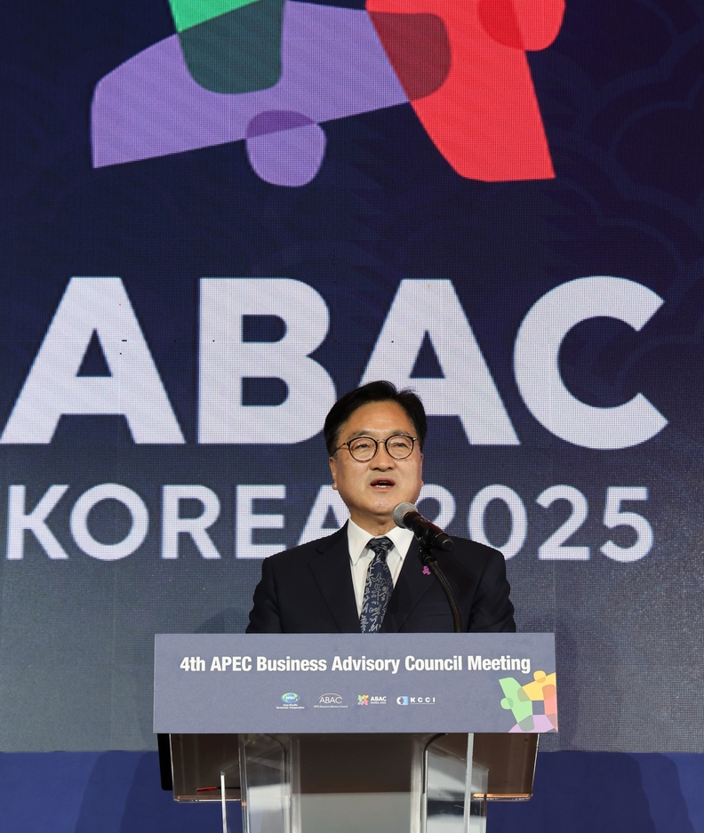 ▲우원식 국회의장이 26일(일) 오전 부산에서 열린 '2025 APEC 기업자문위원회 제4차 회의' 개막식에 참석해 발언하고 있다.(사진=국회사무처)