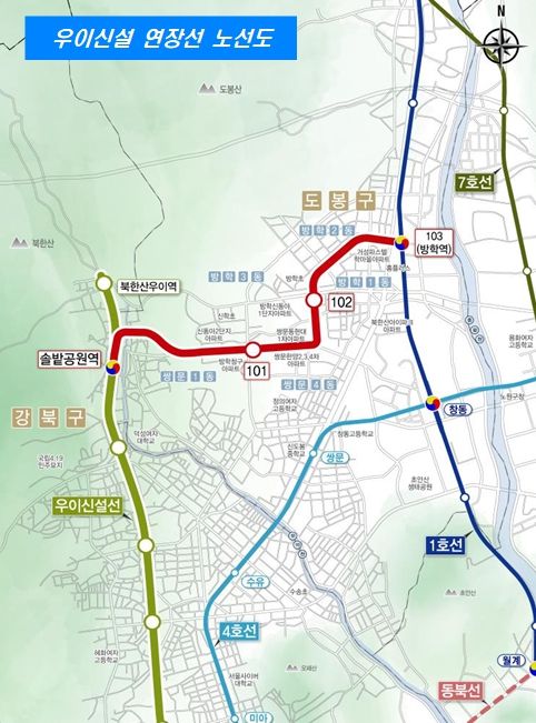 우이신설 연장선은 2017년부터 운영 중인 솔밭공원역(우이신설선)과 방학역(1호선)을 연결하는 사업이다. 2032년 준공을 목표로 총 연장 3.94㎞의 정거장 3개소(방학역 환승 포함)를 신설하며, 총 사업비로 4,690억 원이 투입된다.