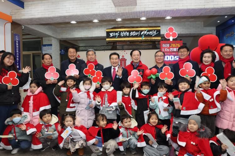 ㈜한국탑뉴스 차복원 기자 | 충북 진천군은 5일 진천군청 중앙현관에서 충북사회복지공동모금회와 함께 ‘희망2026나눔캠페인’ 사랑의 온도탑 제막식과 현장순회모금 행사를 개최했다.