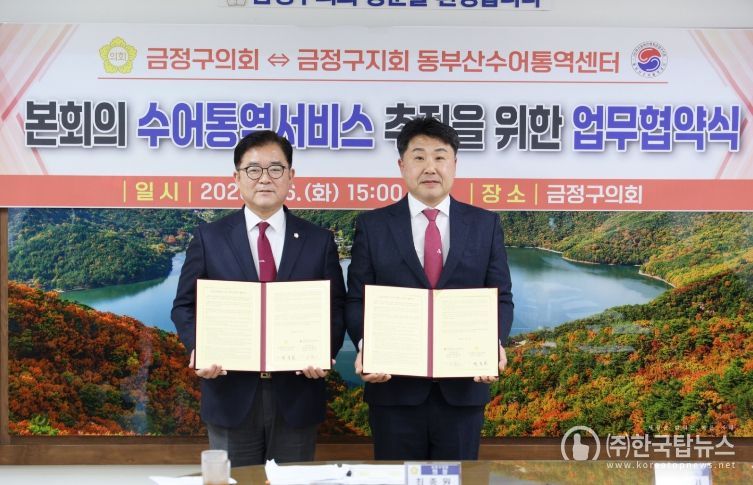 ㈜한국탑뉴스 차복원 기자 | 금정구의회는 2026년 1월 6일, 금정구의회 의장실에서 동부산수어통역센터(센터장 여복기)와 '본회의 수어통역 서비스 제공을 위한 업무협약'을 체결했다.