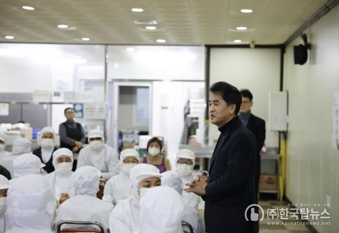 ㈜한국탑뉴스 송행임 기자 | 최재형 보은군수는 19일 ㈜이킴 삼승공장을 방문해 지난해 화재로 피해입은 보은공장 상황과 생산 정상화와 대체 생산 체계 운영 상황을 점검하고 임직원들을 격려했다.