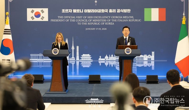 ㈜한국탑뉴스 차복원 기자 | 이재명 대통령은 19일 조르자 멜로니 이탈리아 총리와의 정상회담 뒤 "저와 멜로니 총리는 전략적 동반자 명칭에 부합하는 미래지향적 수준으로 양국 관계를 더욱 발전시켜 나가기로 합의했다"고 밝혔다.