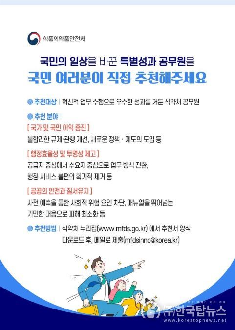 ㈜한국탑뉴스 송행임 기자 | 식품의약품안전처는 국민이 체감하는 탁월한 성과를 창출한 공무원을 국민이 직접 추천해 포상하는 ‘국민추천제’를 1월 20일부터 운영한다고 밝혔다.