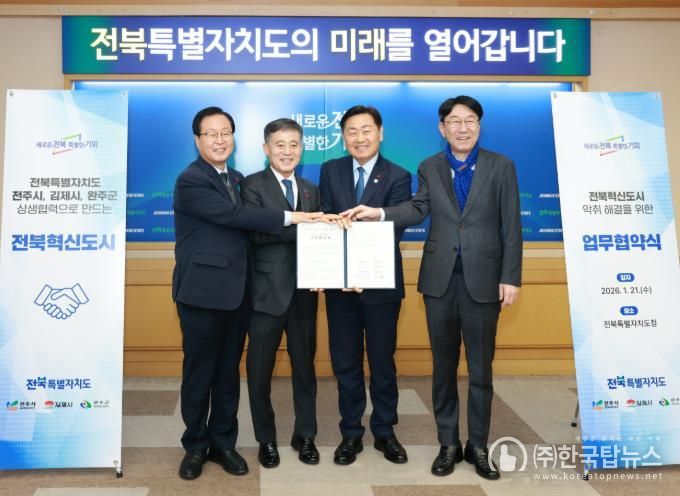 ㈜한국탑뉴스 송행임 기자 | 완주군이 21일 전북특별자치도청에서 전북특별자치도, 전주시, 김제시와 함께 혁신도시 악취 문제 해결을 위한 업무협약을 체결했다.