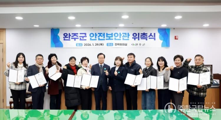 ㈜한국탑뉴스 한기석 기자 | 완주군이 ‘2026년 완주군 안전보안관 위촉식’을 열고 신규 안전보안관 12명에게 위촉장을 수여했다.