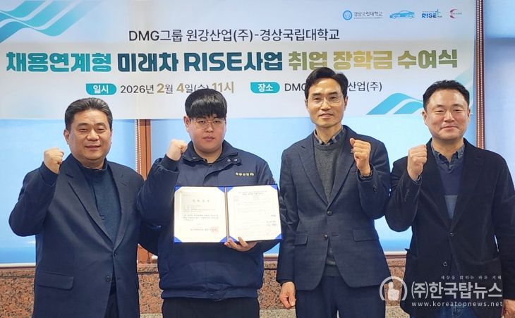 ㈜한국탑뉴스 송행임 기자 | 경상국립대학교는 2월 4일 오전 11시 함안군에 소재한 원강산업(주) 회의실에서 ‘채용연계형 미래차 RISE사업 취업 장학금 수여식’을 개최했다.