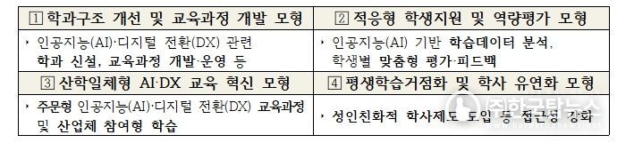 교육부는 2026년 신규 사업 공모를 통해 총 24개 내외 사업단(전문대학)을 선정하여 사업단별 최대 10억 원(총 240억 원)을 지원할 예정이다. 주요 추진 내용으로는 ▲인공지능(AI)·디지털 전환(DX) 환경 조성, ▲재학생·교직원·지역주민 맞춤형 인공지능(AI) 역량 강화, ▲대학별 특화모형 구축이 있다.