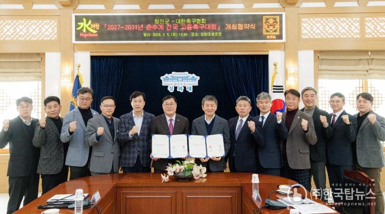 ㈜한국탑뉴스 구민성 기자 | 합천군은 5일 합천영상테마파크 청와대 세트장에서2027~2031년 춘·추계 전국 고등축구대회 개최 협약식을 가졌다고 밝혔다.