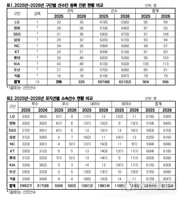 ㈜한국탑뉴스 구민성 기자 | KBO는 2월 10일(화) 2026년 KBO 리그 소속 선수 명단을 공시했다. 10개 구단은 총 621명의 선수를 등록해, 597명이 등록했던 2025년보다 24명이 늘어났다.
