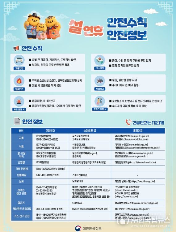 ㈜한국탑뉴스 송행임 기자 | 행정안전부는 국민께서 안전하고 즐거운 설 명절을 보낼 수 있도록 중앙 및 지방정부 합동으로 ‘설 연휴 안전관리 대책’을 추진한다.