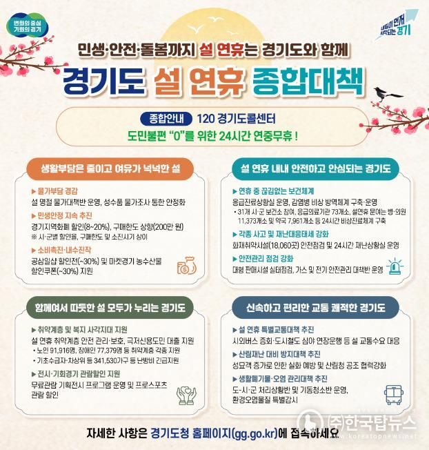 ㈜한국탑뉴스 송행임 기자 | 경기도가 도민들이 따뜻하고 편안한 명절을 보낼 수 있도록 ‘설 연휴 종합대책’을 추진한다.