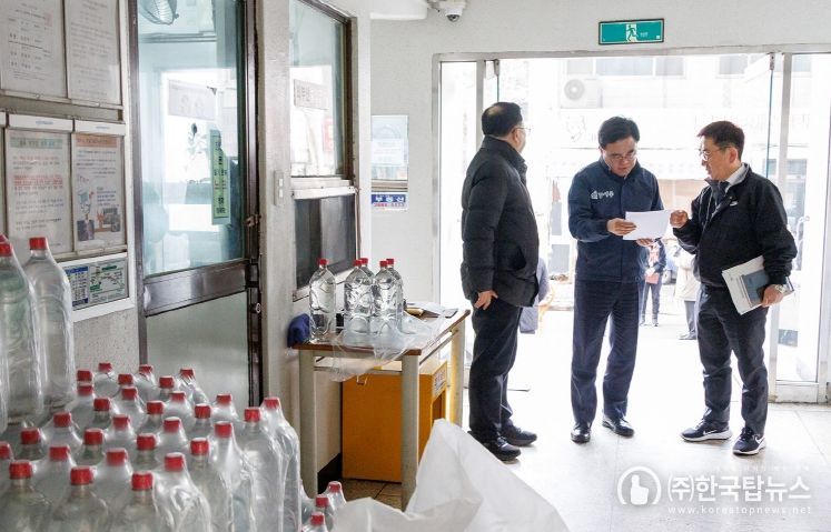 ㈜한국탑뉴스 송행임 기자 | 진교훈 서울 강서구청장이 11일 오후 단수로 불편을 겪고 있는 방화동의 한 아파트를 찾아 주민 피해 현황과 복구 진행 상황을 점검했다.