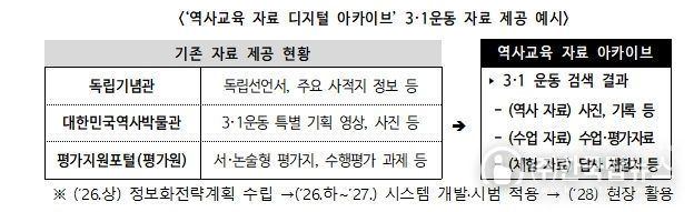 또한, 학생의 탐구 역량을 키우는 역사 수업 활성화를 위해 ‘탐구 중심 역사 교육과정 운영 사례집’(’26. 3종→’27. 9종)을 개발·보급한다. 더불어, 각종 기관·누리집(플랫폼) 등에 분산된 근현대 사료와 교육자료, 체험 자료 등을 수업에 즉시 활용할 수 있도록 교사에게 묶음(패키지) 형태로 제공하는 ‘역사교육 자료 아카이브’를 구축(ʹ27)할 예정이다.