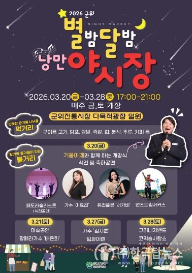 ㈜한국탑뉴스 송행임 기자 | 군위군은 전통시장에 활력을 불어넣고 군민과 방문객들에게 봄밤의 추억을 선사하기 위해 '군위전통시장 별밤달밤 낭만 야시장'을 오는 3월 20일 개장해 3월 28일까지 매주 금요일과 토요일 운영한다고 밝혔다.