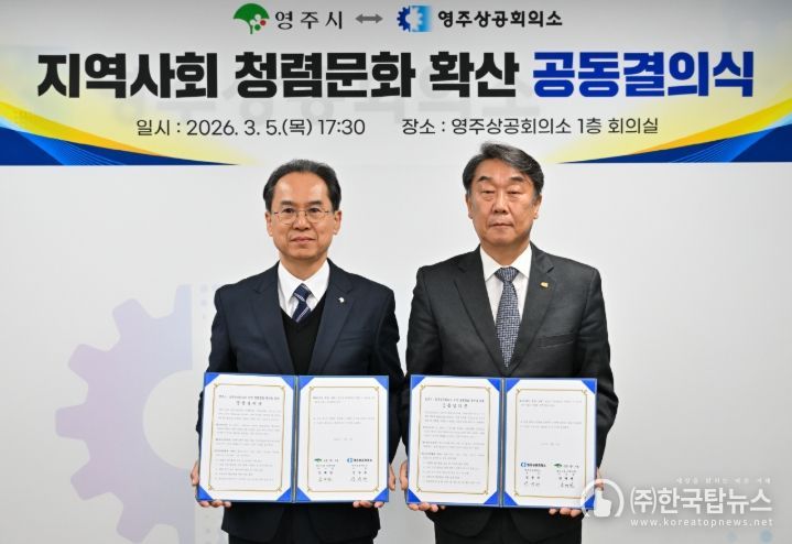 ㈜한국탑뉴스 송행임 기자 | 영주시는 지난 5일 영주상공회의소와 함께 '지역사회 청렴문화 확산 공동결의식'을 개최하고, 민·관이 함께 청렴 실천 의지를 다졌다.