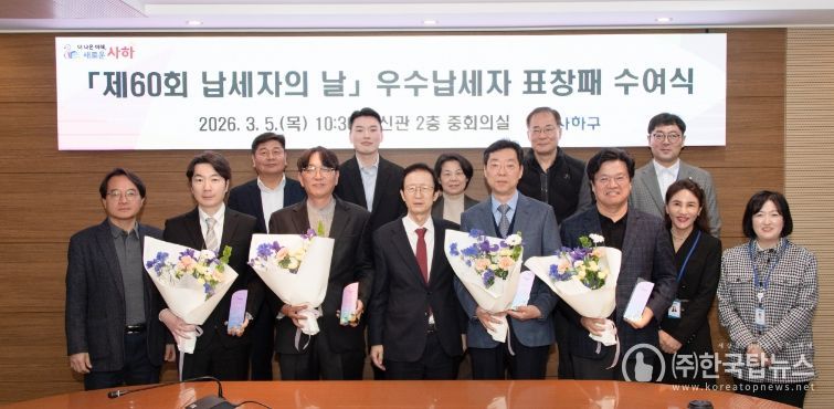 ㈜한국탑뉴스 송행임 기자 | 부산 사하구는 ‘제60회 납세자의 날’을 맞아 지난 5일 '2026년 사하구 우수납세자 표창패 수여식'을 개최하여 어려운 여건에서도 성실하게 지방세를 납부한 우수납세자에게 감사의 마음을 전했다.