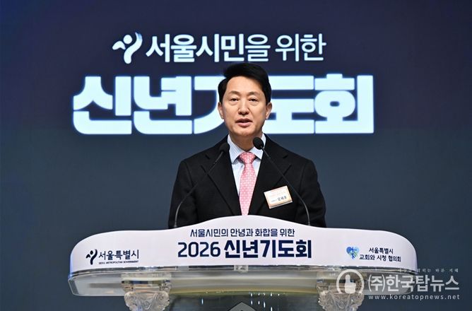 ㈜한국탑뉴스 송행임 기자 | 오세훈 서울시장은 9일 오전 7시 20분, 신길교회(영등포구 영등포로67가길 9)에서 서울특별시교회와시청협의회 주최로 열린 ‘2026 신년기도회’에 참석해 서울 시민의 안녕과 화합을 위해 기도했다.