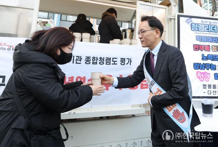 ㈜한국탑뉴스 송행임 기자 | 꿈이 모이는 도시, 미래를 그리는 강남구가 3월 11일 구청에서 ‘여러분 덕분입니다’ 청렴캠페인을 진행했다. 2025년 공공기관 종합청렴도 평가에서 3년 연속 청렴 우수등급을 달성한 것을 기념하고, 반부패·청렴 실천 의지를 다시 다지기 위해 마련한 행사다.