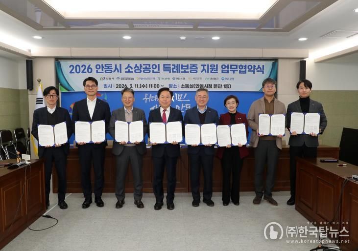 ㈜한국탑뉴스 송행임 기자 | 안동시는 3월 11일 시청 소통실에서 경북신용보증재단 및 6개 협약은행과 함께 '2026년 안동시 소상공인 특례보증 지원 업무협약'을 체결했다.
