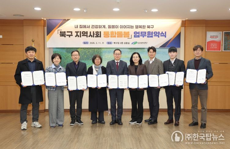 ㈜한국탑뉴스 송행임 기자 | 대구 북구청은 3월 11일 북구형 통합돌봄 지역특화사업 추진을 위해 지역 의료․돌봄․복지 관련 기관 8개소와 업무협약을 체결했다.