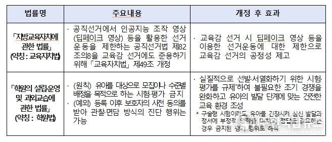 교육부는 이번 법률 개정을 통해, 공직선거에서 인공지능 조작 영상(딥페이크 영상) 등을 활용한 선거운동을 제한하는 '공직선거법' 제82조의8을 교육감 선거에도 준용하여 교육감 선거의 공정성을 높이고자 했다.